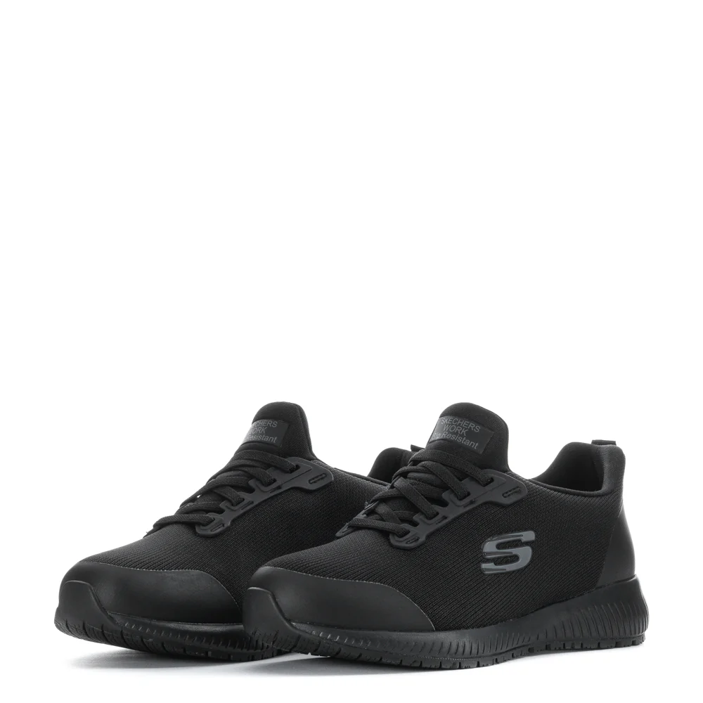 You'll whistle while you work when your feet feel this good in the Skechers Squad SR Wide Women's Sneakers. These feature the famous Skechers Memory Foam™ insole that cushions every step you take. Because they're water resistant, your feet will stay dry even if you have a spill.